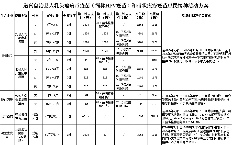 答:根据《道真自治县卫生健康局关于开展部分非免疫规划疫苗惠民接种工作的通知》规定本次适龄人群带状疱疹及宫颈癌疫苗接种惠民措施拟于2025年7月1日正式启动,默沙东四价、九价宫颈癌疫苗,在2025 年7 月1 日-2025 年11 月30 日期间接种首针,且于2026 年5 月31 日前完成全程接种;厦门万泰双价宫颈癌疫苗,在2025 年7 月1 日-2025 年12 月31 日期间接种首针;长春百克带状疱疹减毒疫苗,在2025 年7 月1 日-2025 年12 月31 日期间接种;葛兰素史克重组带状疱疹(CHO细胞),在2025 年7 月1 日-2025 年9 月30 日期间接种首针,且于2025 年12 月31 日前完成两针次全程接种。接种对象、首针及最后一针结束时间参照本文件执行。