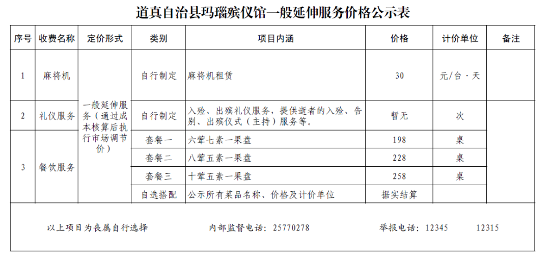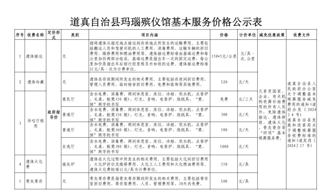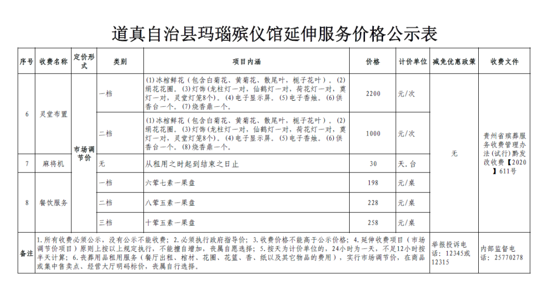 道真自治县玛瑙殡仪馆一般延伸服务价格公示表和道真自治县玛瑙山公墓价格公示表